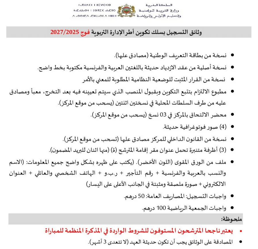 الوثائق المطلوبة لتسجيل طلبة سلك تكوين أطر الادارة التربوية برسم الموسم التكويني 2025-_2026