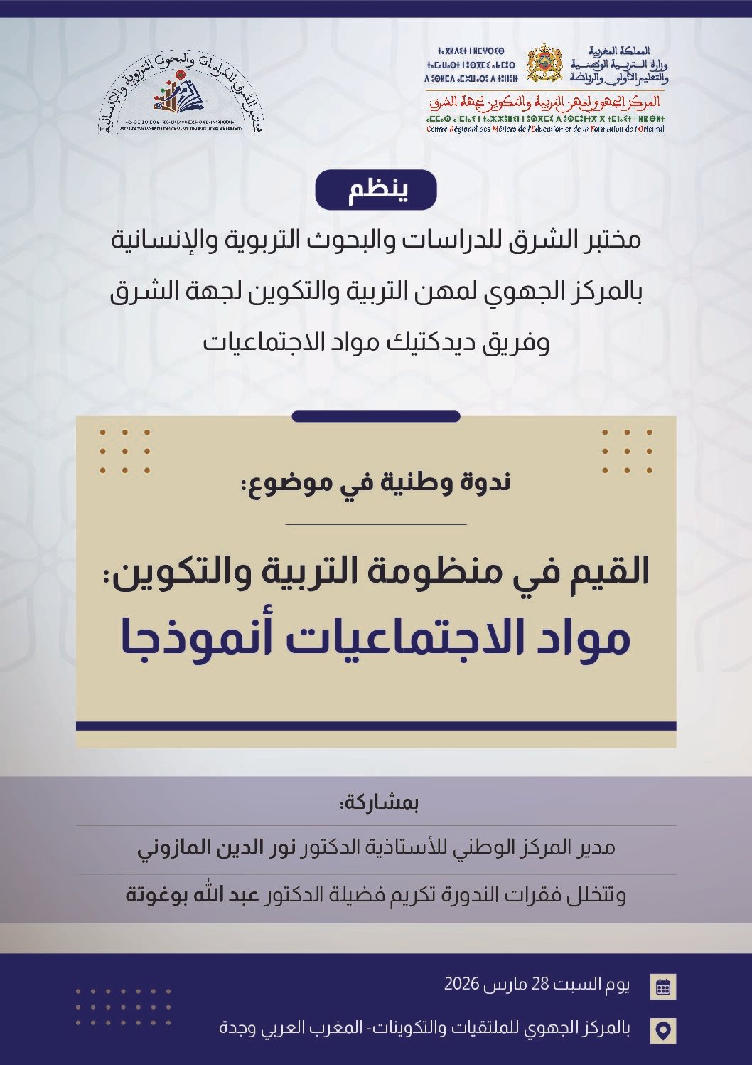 ورقة ندوة القيم Post Views: 4 تصفّح المقالات ندوة وطنية تحت عنوان” الدعم التربوي ورهان تحسين جودة التعلمات”